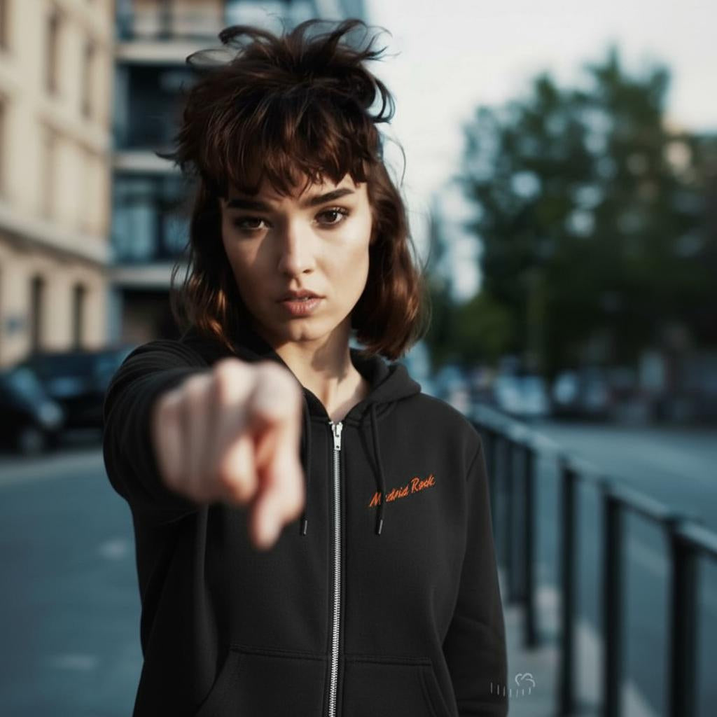 Sudadera negra con cremallera, con el logo de Madrid Rock en pequeño en color naranja en el lado izquierdo del pecho y Rocko en la espalda en color naranja.